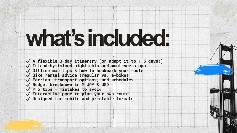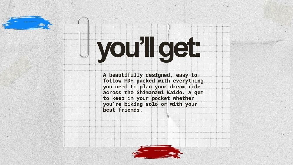A beautifully designed, easy-to-follow PDF packed with everything you need to plan your dream ride across the Shimanami Kaido. A gem to keep in your pocket whether you're biking solo or with your best friends.